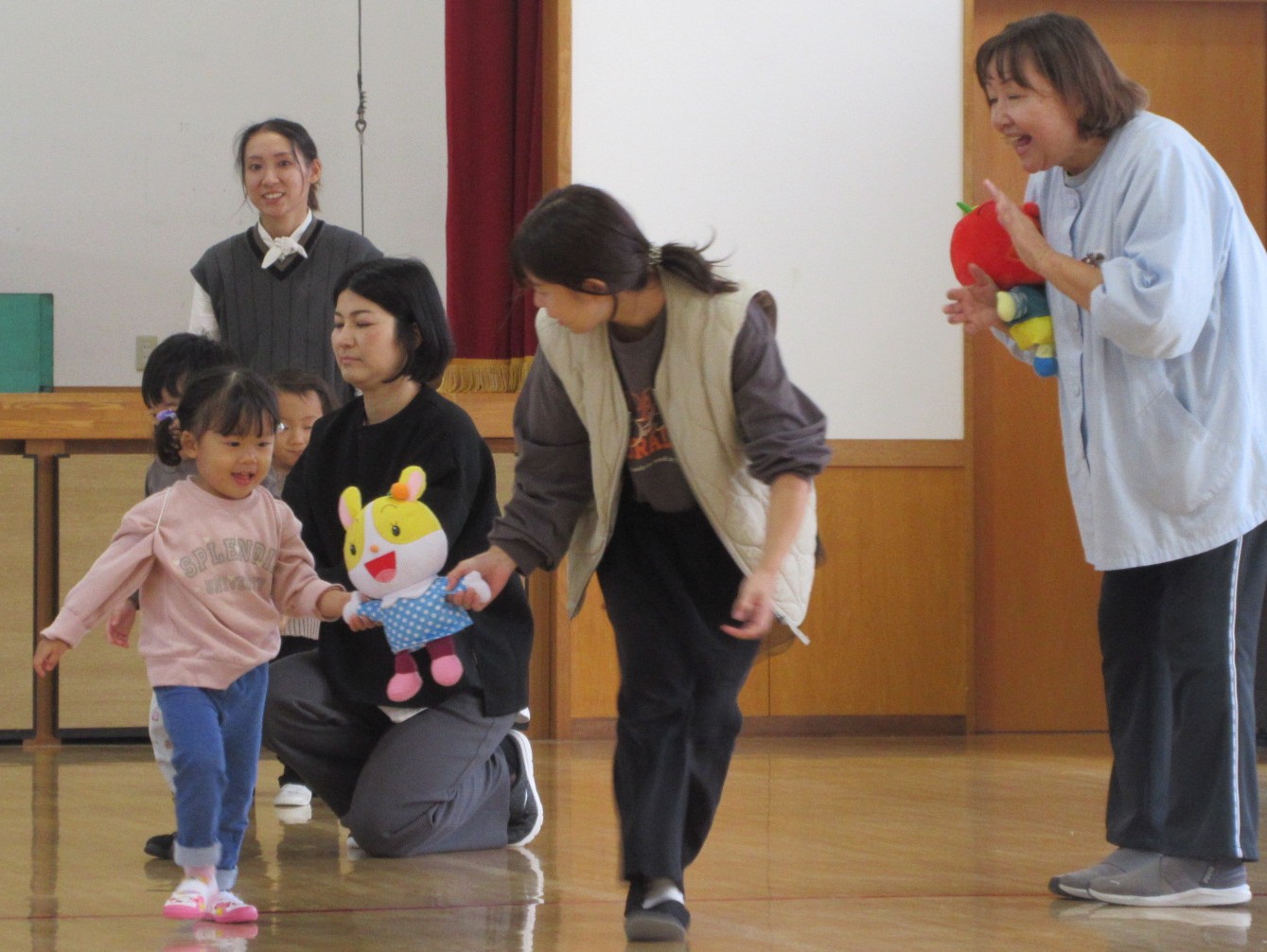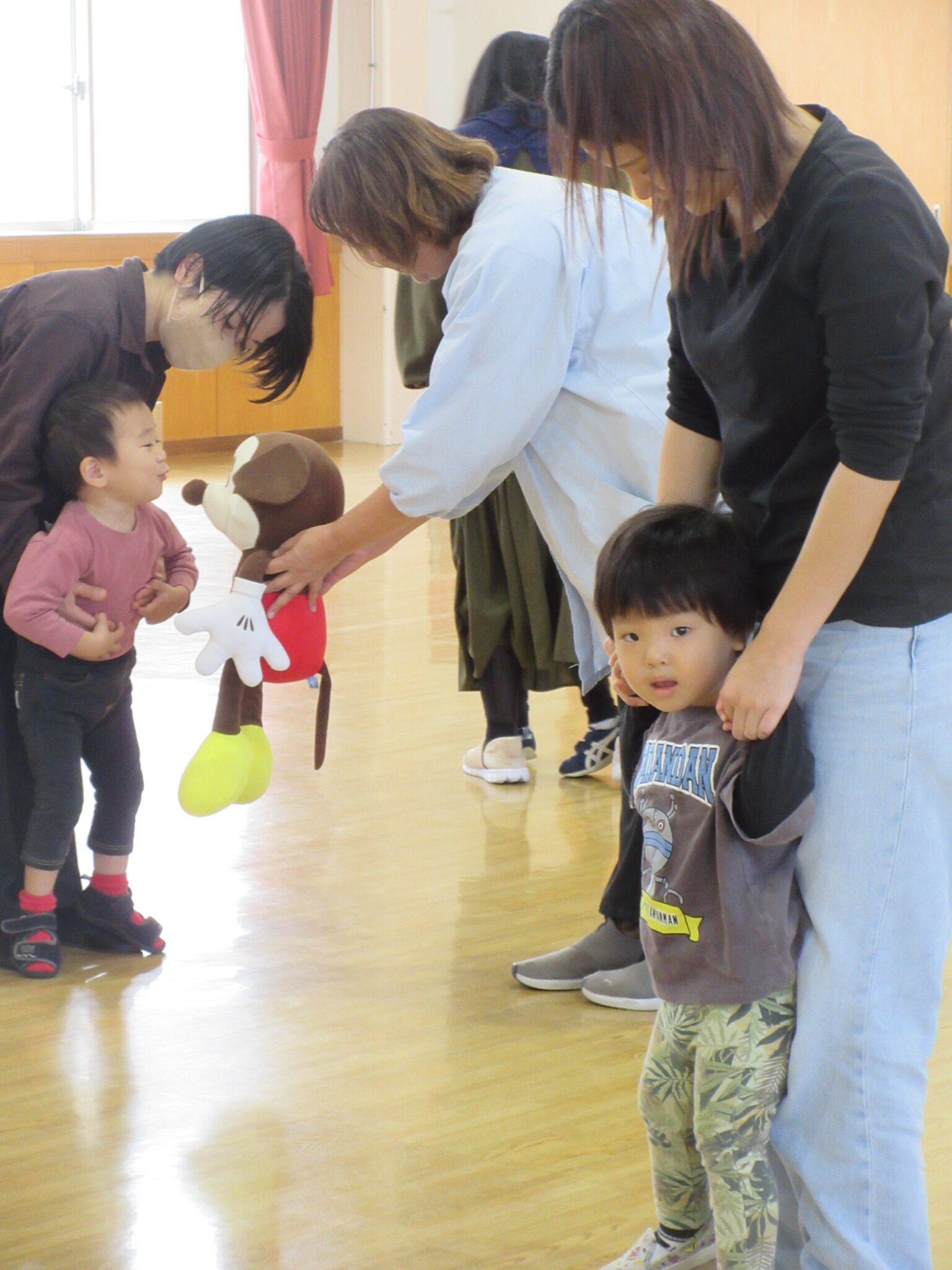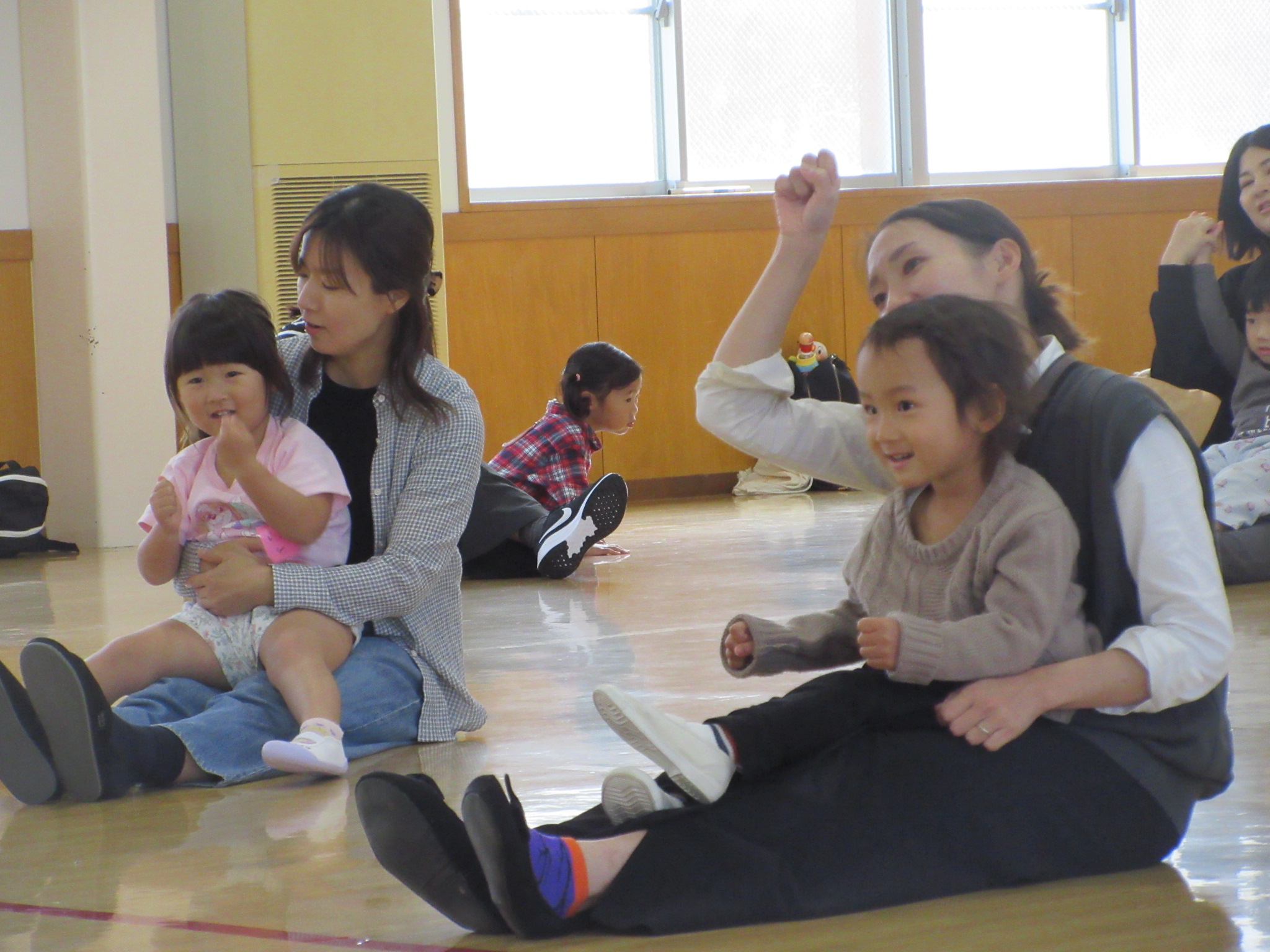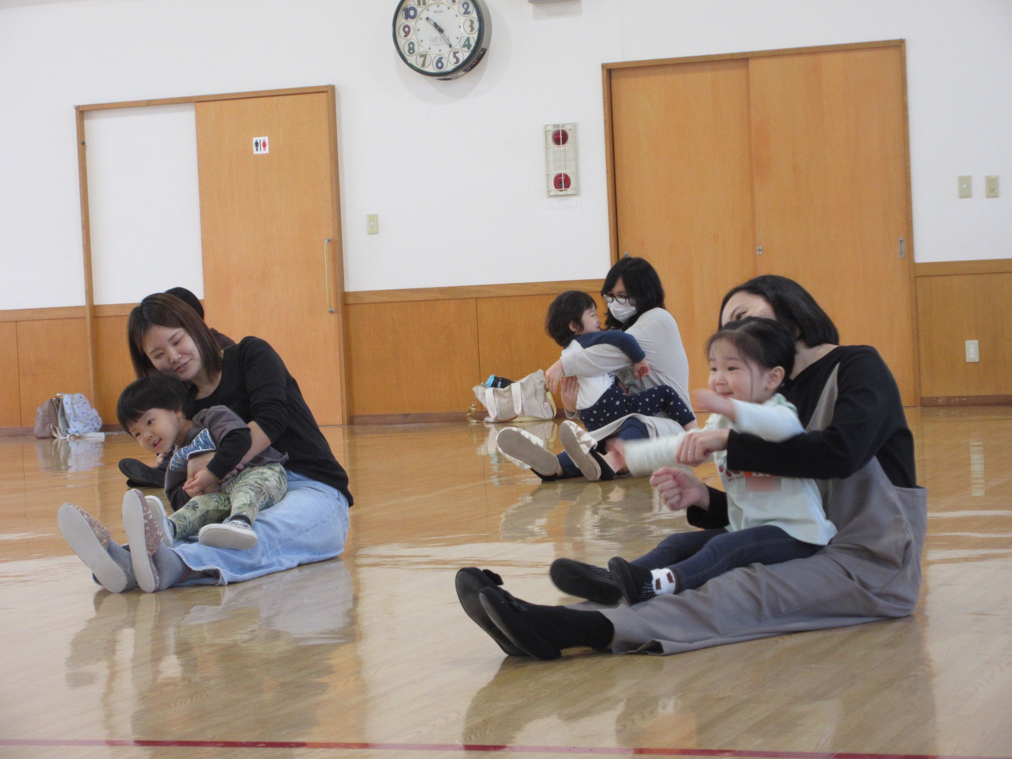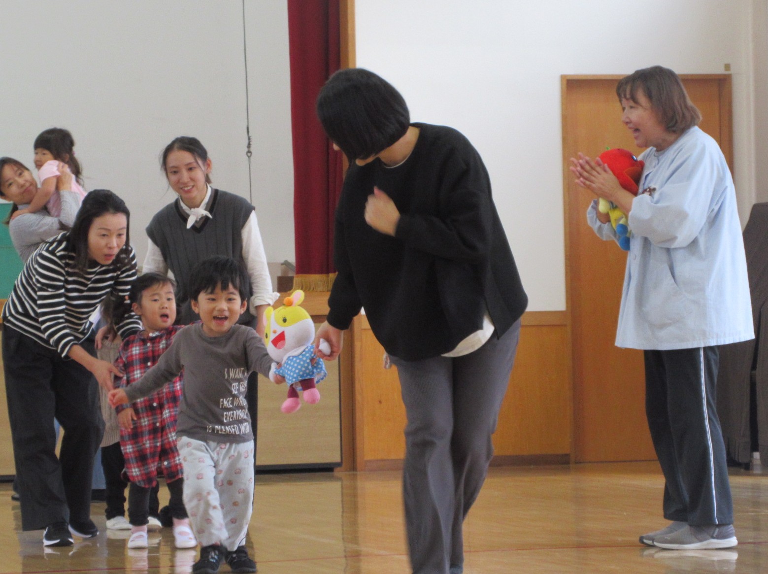 今回は、ありんこ教室です。親子体操と運動会ごっこを行いました。